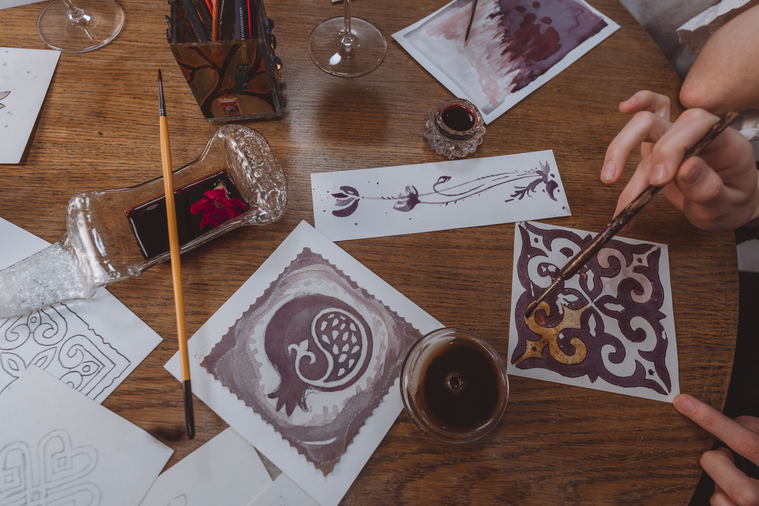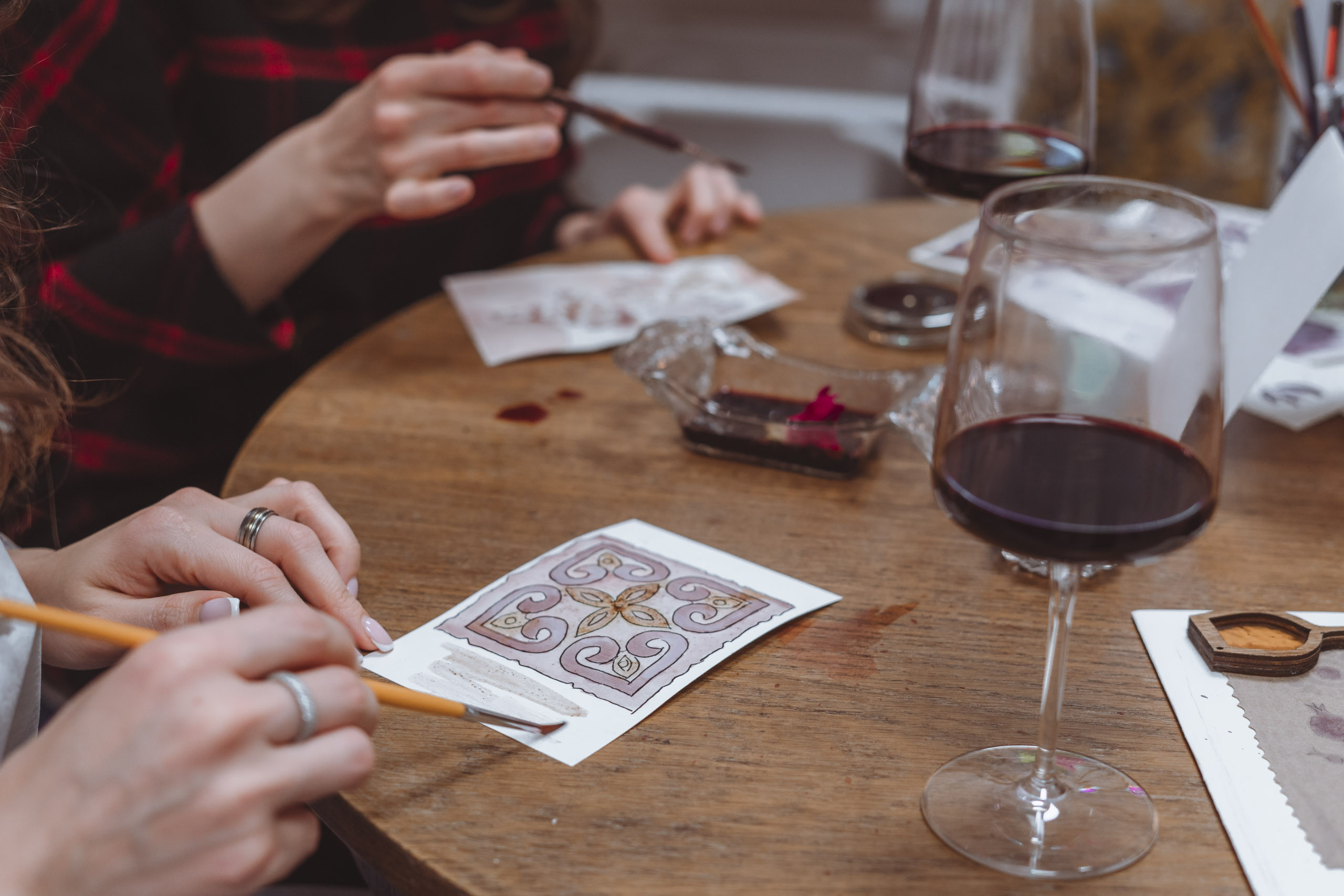 ნახატს შეიძლება დაემატოს აკვარელით ან შავი მელნით შესრულებული დეტალები, ქართული ასოები და ორნამენტები. ნახატების დასრულების შემდეგ, სანამ ნამუშევრები შრება, სტუმრები ტკბებიან ღვინით და ყავით.
