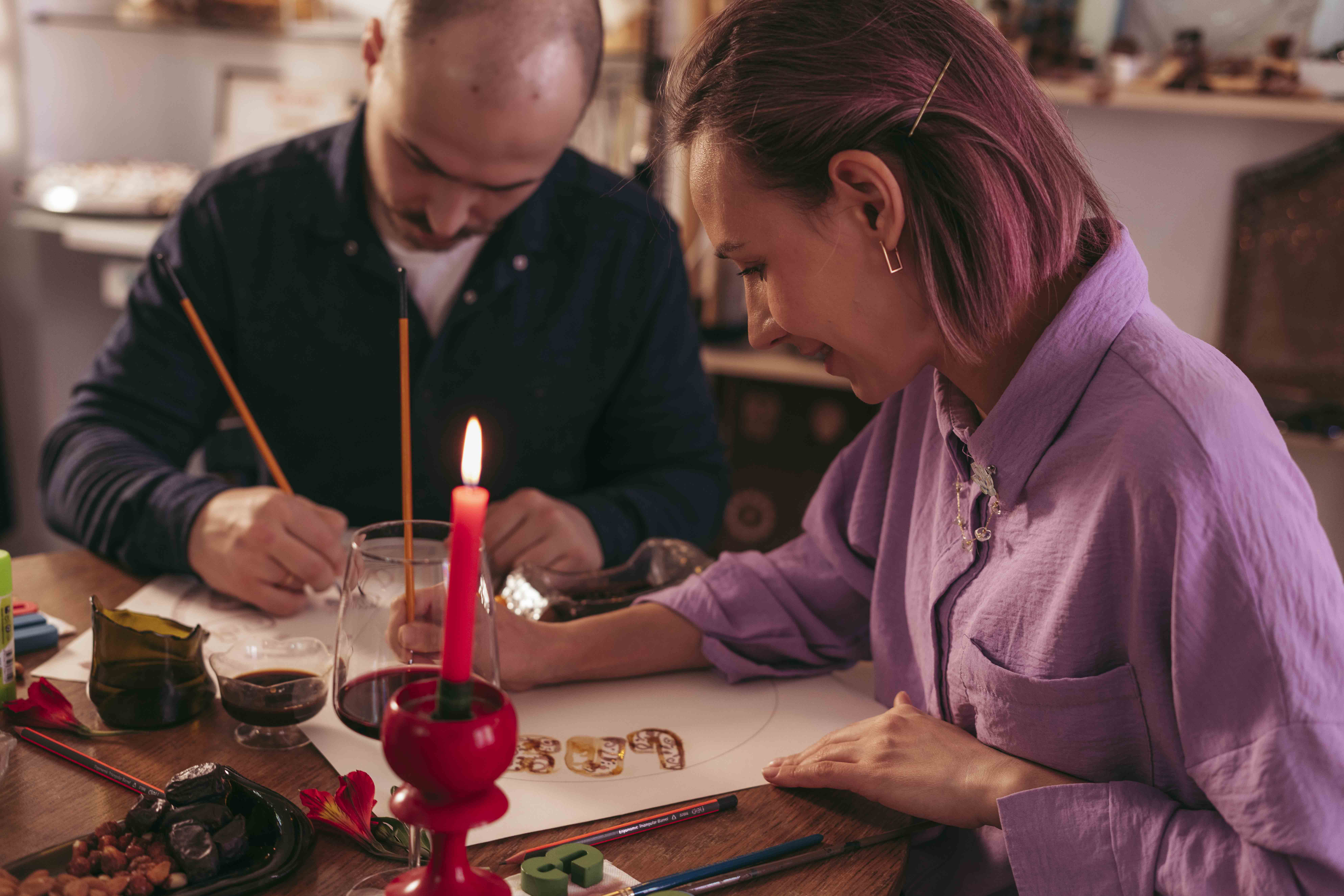 ღვინის grissaile-ის მასტერკლასზე, ოსტატი ხსნის ღვინით შემოქმედებითი პროცესის სირთულეებს და გაგიზიარებთ ღვინის (და სხვა) ტექნიკის საიდუმლოებებს. შეგიძლიათ შექმნათ წყვილის ინიციალები და დაამშვენოთ ქართული კალიგრაფიისა და ქართული ორნამენტებით, ან შეგიძლიათ აირჩიოთ ახვა განსხვავებული თემა.